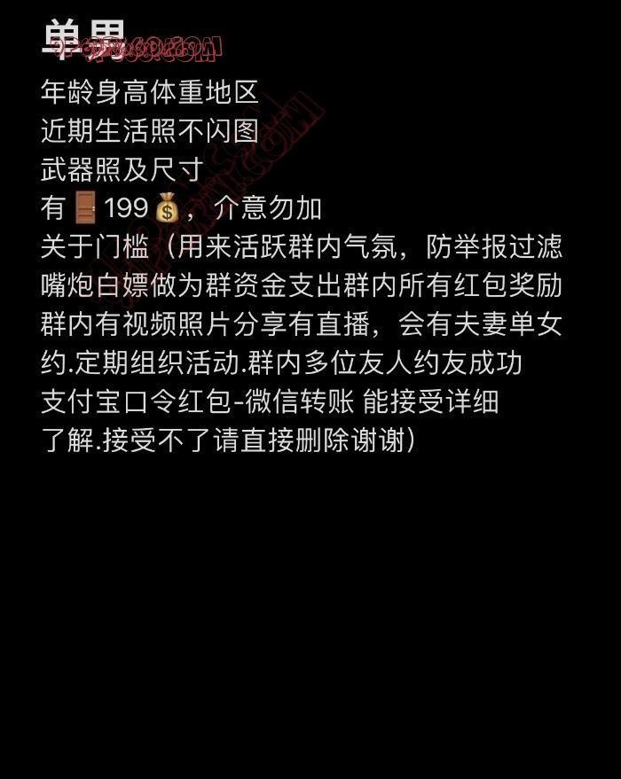 关于门槛:过滤嘴炮白嫖屌丝,作为群资金活跃气氛,群内视频照片分享直播,夫妻单女线下邀约,群内多位成员约友成功