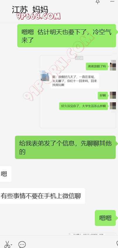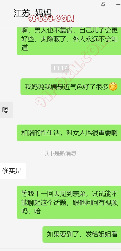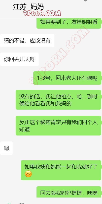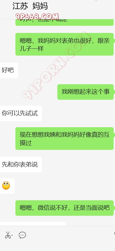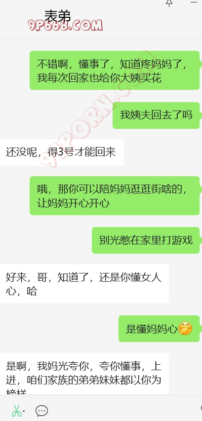 加入和表弟,我姨和我妈妈的4p话题,还有我妈妈和我姨的女女话题,哈。她还在那一本正经的帮我出主意,怎么才能4p。找了个粉丝,演我表弟,和表弟的对话发给她看。