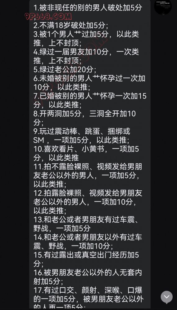 11.拍不露脸裸照、视频发给男朋友老公以外的男人,一项加5分,以此类推;