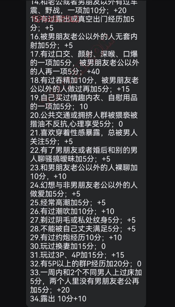 11.拍不露脸裸照、视频发给男朋友老公以外的男人,一项加5分,以此类推;